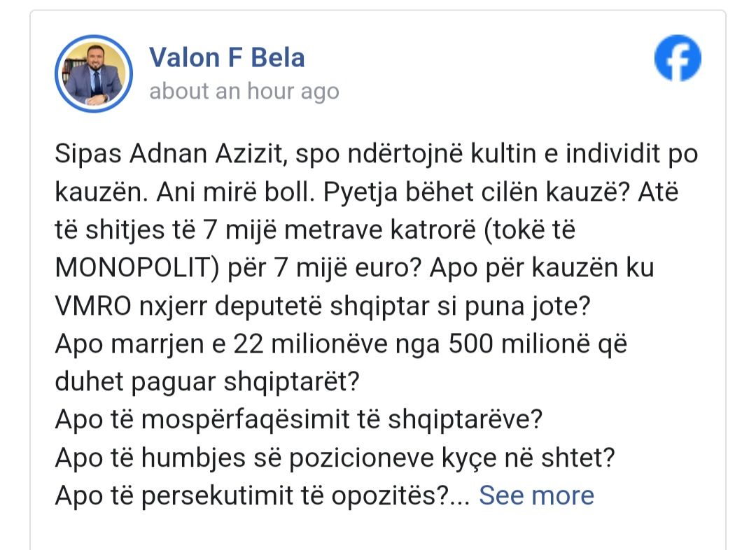 Sipas Adnan Azizit, spo ndërtojnë kultin e individit po kauzën. Ani mirë boll. Pyetja bëhet cilën kauzë? Atë të shitjes të 7 mijë metrave katrorë (tokë të MONOPOLIT) për 7 mijë euro? Apo për kauzën ku VMRO nxjerr deputetë shqiptar si puna jote?