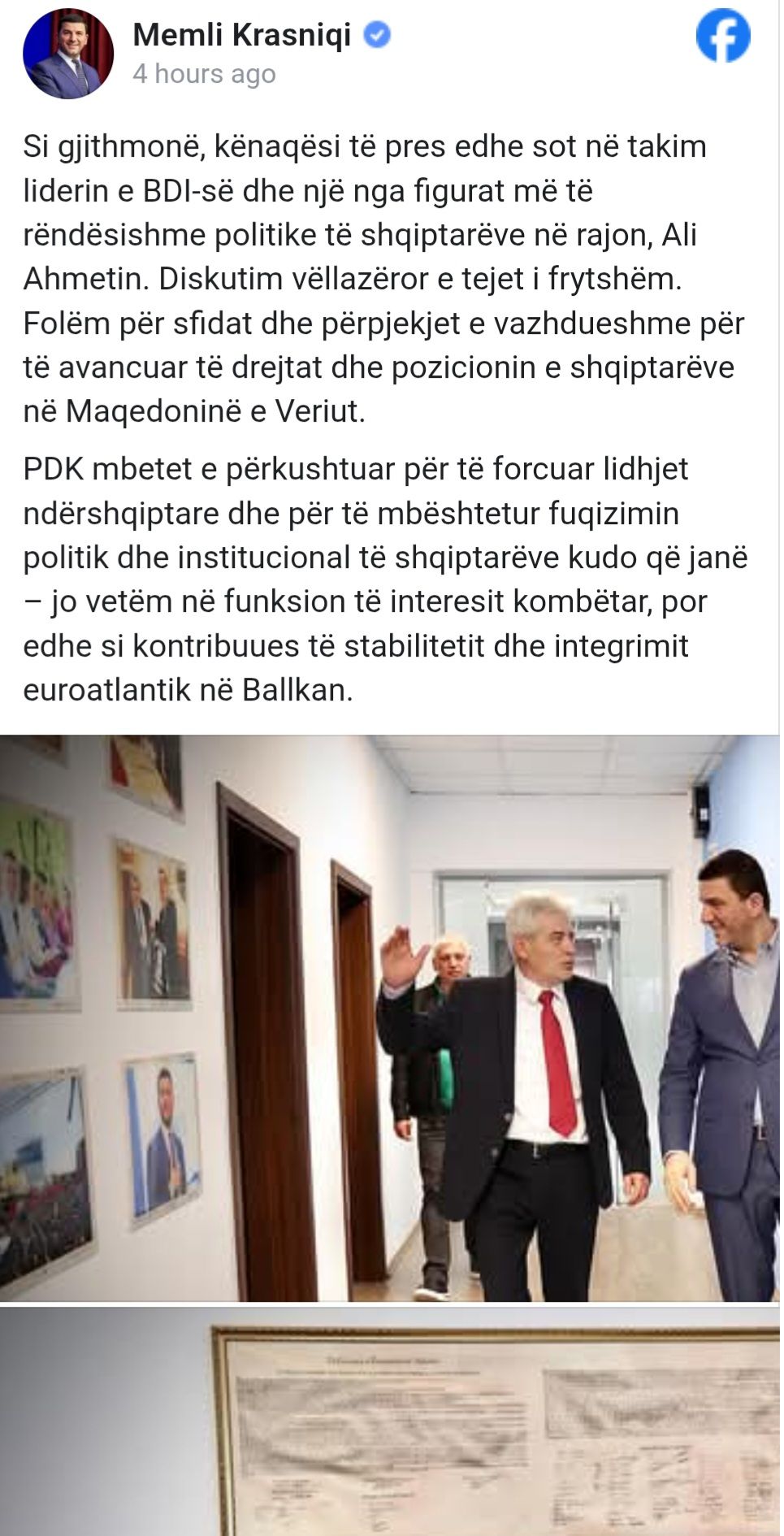 Krasniqi ka njoftuar në Facebook se me Ahmetin ka pasur një diskutim vëllazëror e tejet të frytshëm.