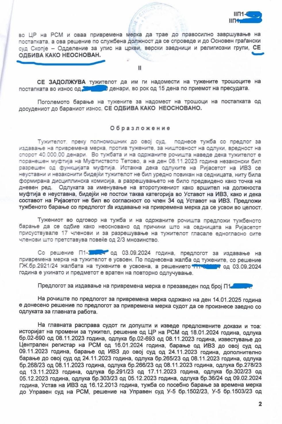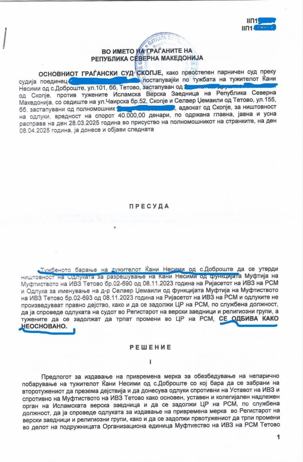 -REFUZOHET si e PABAZË kërkes padia për shpallje si të pavlefshme të vendimeve të Rijasetit të BFI-së për SHKARKIMIN e Qani Nesimit dhe emërimin e Dr.Selver Xhemailit si Myfti i Tetovës.