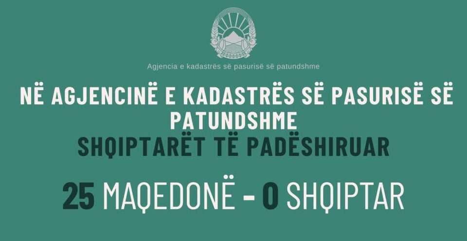 Bashkimi Demokratik për Integrim shpreh indinjatën më të thellë për përjashtimin sistematik të shqiptarëve nga institucionet e shtetit, veçanërisht nga institucionet e administratës shtetërore dhe publike. Rasti i fundit në Agjencinë e Kadastrës së Pasurisë së Patundshme, ku bilanci i avansimeve dhe punësimeve të fundit është 25 me 0, është dëshmi e qartë e kësaj politike diskriminuese dhe përjashtuese.
