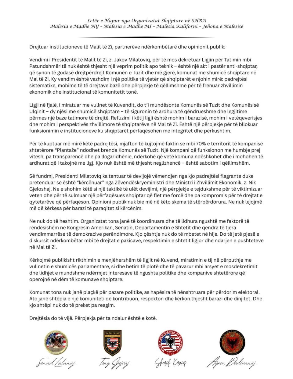 Reagimi aspak demokratik i presidentit malazias Milatoviq, me rastin e mosdekretimit të ligjit për Patundshmëritë, ligj i cili godet interesat e shqiptarëve në Tuz e gjithandej, ka shtyrë katër organizatat atdhetare të Malësisë në Amerikë, të shkruajnë letër të hapur.