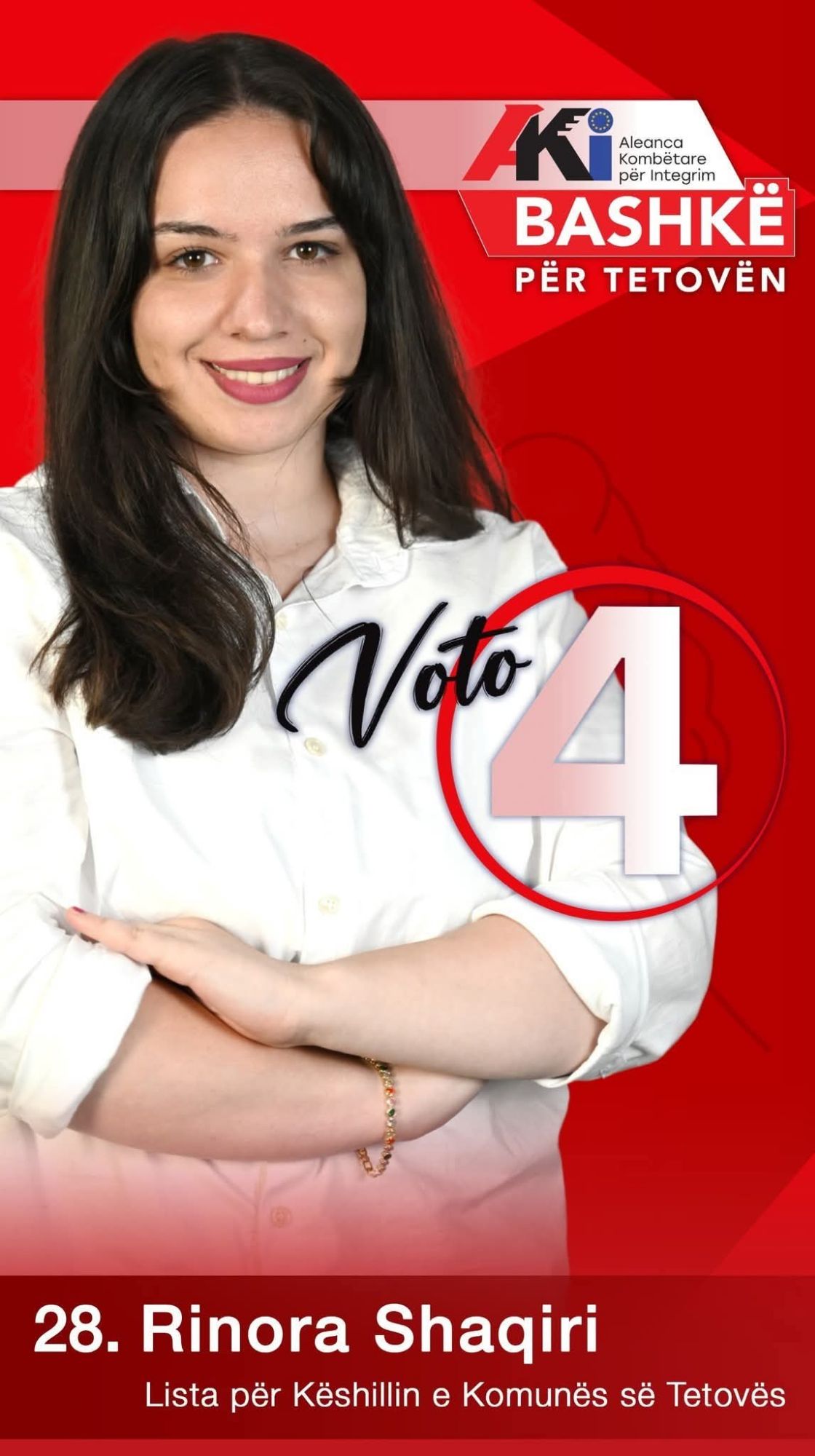Rinora Shaqiri është një kandidate e re, e motivuar dhe e përkushtuar, që synon të sjellë një frymë të re dhe vizion modern në vendimmarrjen lokale të Tetovës. Ajo ka përfunduar arsimin fillor dhe të mesëm në Maqedoni, ndërsa studimet profesionale i ka ndjekur për tre vite në drejtimin Menaxhment dhe Marketing (Berufsschule/Ausbildung). Gjatë kësaj periudhe, Rinora ka fituar njohuri të thelluara në organizim, komunikim dhe promovim të produkteve dhe shërbimeve, aftësi që ajo i sjell në shërbim të komunitetit dhe qytetarëve të Tetovës.