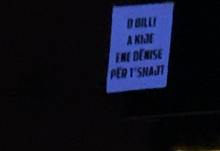 Droni mbante një pankartë me mbishkrimin: “O Billi, a kije ene dënise për te shajt?”.
