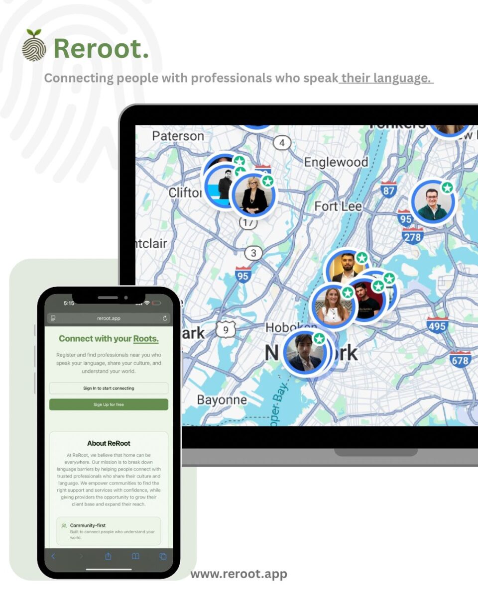 ReRoot është një platformë që lidh njerëzit me profesionistë që flasin gjuhën e tyre amtare, duke e bërë komunikimin më të qartë, më të sigurt dhe më njerëzor në çdo fushë shërbimesh. Ideja lindi nga përvoja reale dhe vëzhgimi i përditshëm i vështirësive që hasin emigrantët kur gjuha bëhet pengesë për të marrë ndihmën që u nevojitet. Një moment shumë domethënës ishte një vizitë mjekësore ku pacientët kishin ardhur të shoqëruar nga familjarë vetëm për të komunikuar, gjë që tregoi sa e rëndë është varësia që krijon mungesa e gjuhës.