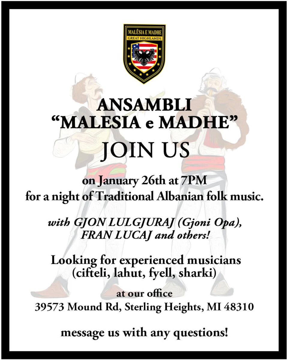 Shoqata Atdhetare “Malësia e Madhe” njofton të gjithë instrumentalistët e çiftelisë, bilbilit, fyellit, lahutës dhe sharkisë, kengetaret, si dhe te gjithe dashamirësit e folklorit në komunitetin shqiptar të Michiganit, se do të filloje organizimi i Ansamblit “Malësia e Madhe” në Michigan, me qellim ruajtjen dhe promovimin e folklorit dhe kulturës shqiptare në Amerike.