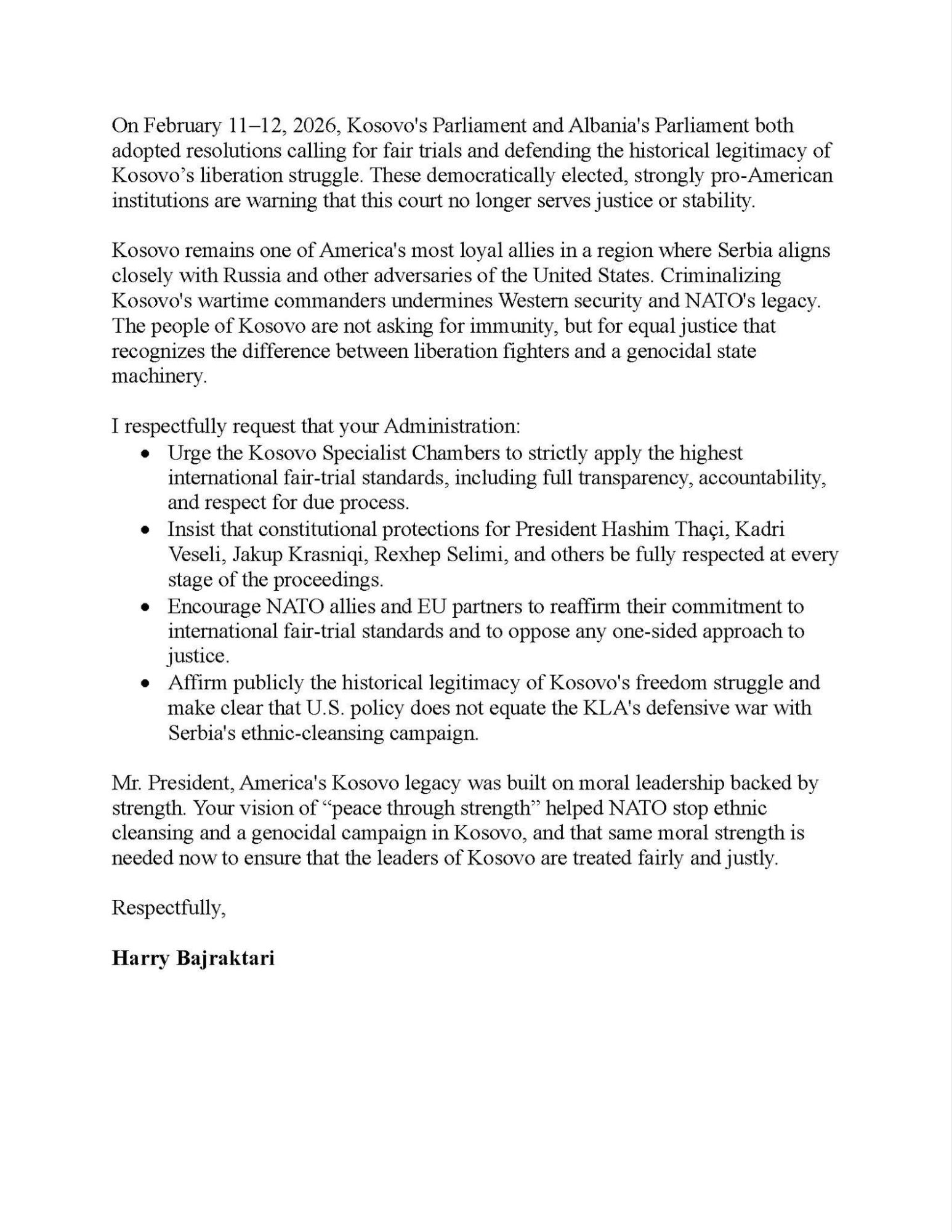 Veprimtari dhe përfaqësues i komunitetit shqiptaro-amerikan, Harry Bajraktari, ka njoftuar se i ka dërguar një letër zyrtare Presidentit të Shteteve të Bashkuara, Donald J. Trump, përmes së cilës ka shprehur shqetësimin e tij lidhur me proceset gjyqësore ndaj ish-udhëheqësve të Kosovës që po zhvillohen në Hagë.