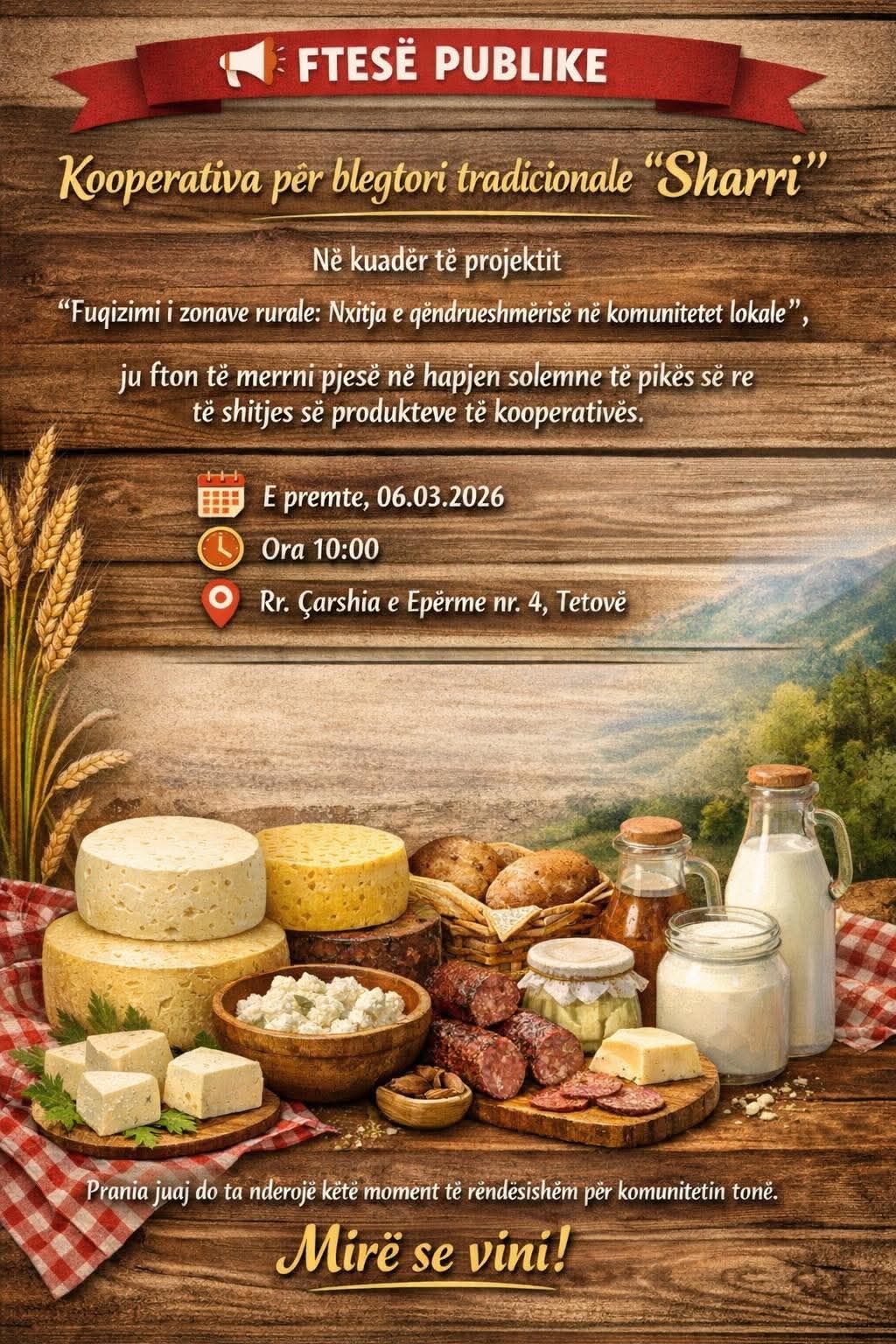 Me kënaqësi të veçantë ju njoftojmë se Kooperativa për blegtori tradicionale “Sharri” do të bëjë hapjen solemne të pikës së saj të re të shitjes në Tetovë, në kuadër të projektit: