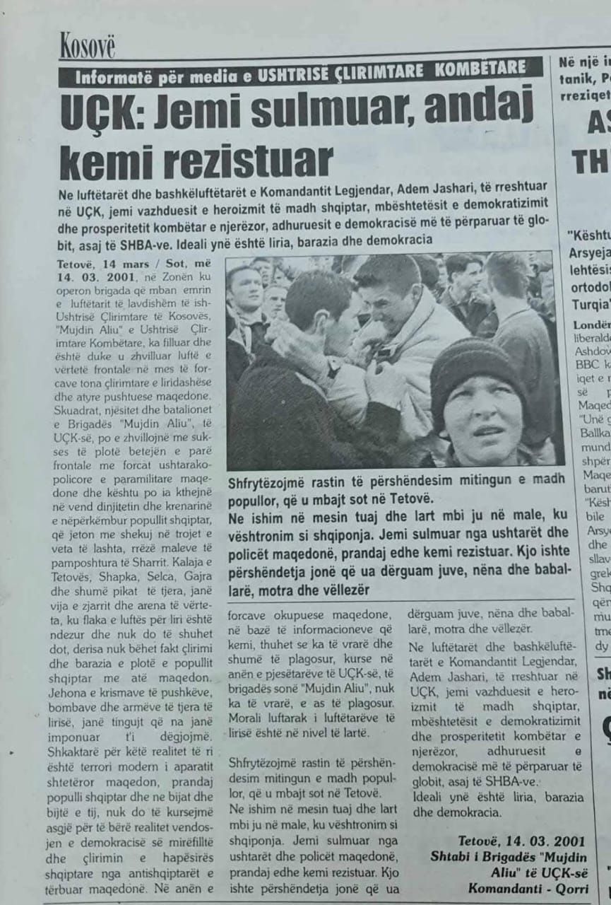 SHBA-të përmenden në dokumentin e Brigadës 112 “Mujdin Aliu” te UÇK-së, në NJOFTIMIN e publikuar më 14 Mars 2001, thuhet se luftëtarët janë, “adhuruesit e demokracisë më të përparuar të globit, asaj të SHBA-ve”,teksti plotë i pasuesit është:”…Ne luftëtarët dhe bashkëluftëtarët e Komandantit Legjendar Adem Jashari, të rreshtuar në UÇK, jemi vazhduesit e heroizmit të madh shqiptar, mbështetësit e demokratizimit dhe prosperitetit kombëtar e njerëzor, adhuruesit e demokracisë më të përparuar të globit, asaj të SHBA-ve…”!