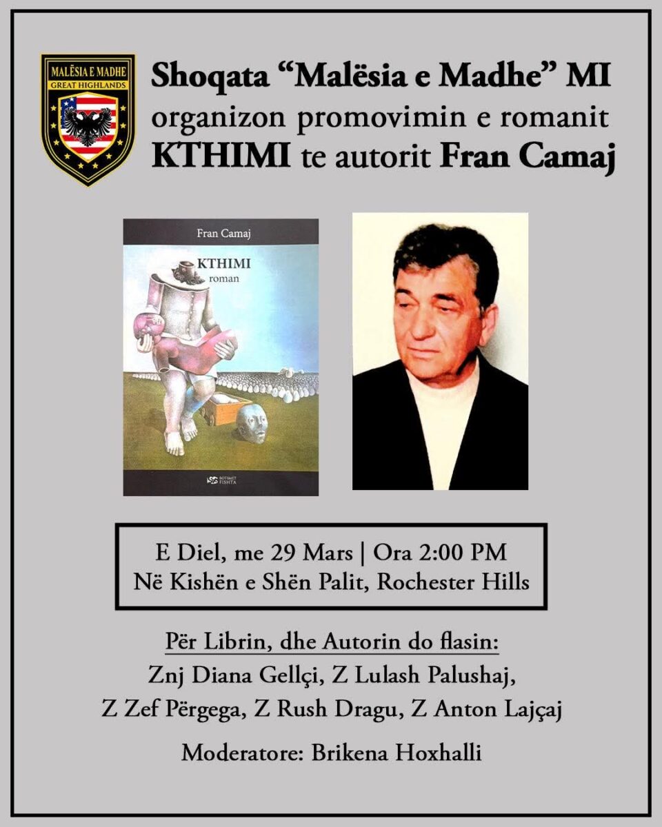 Shoqata Atdhetare “Malësia e Madhe” në Michigan, lajmron komunitetin e Detroitit, dhe më gjëre, se organizon promovimin e romanit “Kthimi”, të autorit Profesor Fran Camaj.