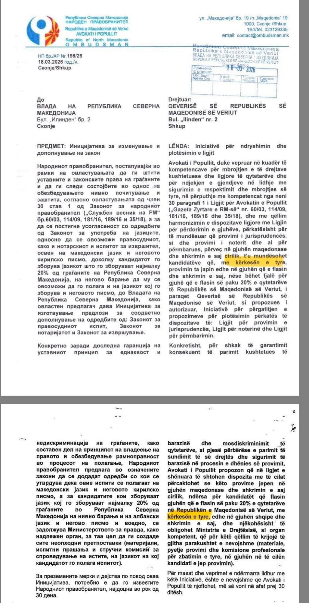 Problemi nuk është mungesa e harmonizimit të ligjeve, por mungesa e vullnetit për të zbatuar Ligjin për Përdorimin e Gjuhëve dhe propozimi i këtillë i Avokatit të Popullit nuk është gjë tjetër përveç se ulje e standardit të të drejtave gjuhësore duke e kushtëzuar përdorimin e gjuhës shqipe me kërkesë. Në bazë të këtij propozimi skandaloz, me të drejtë shtrohet pyetja se çka do të ndodh nëse ligji nuk harmonizohet, a kanë të drejtë studentët apo jo?