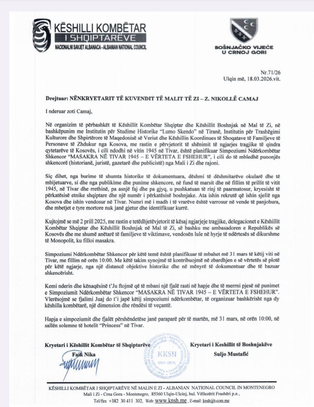 Nënkryetari i Parlamentit të Malit të Zi, Nikollë Camaj, ka shkruar një mesazh vlerësimi dhe mbështetjeje për organizimin e Simpoziumit Ndërkombëtar Shkencor “Masakra e Tivarit 1945 – e vërteta e fshehur”.
