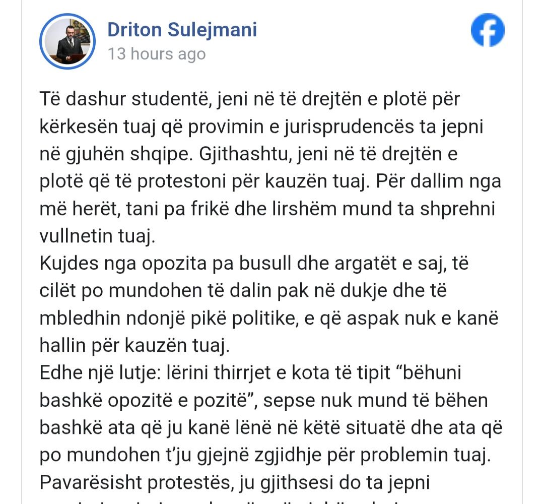 Të dashur studentë, jeni në të drejtën e plotë për kërkesën tuaj që provimin e jurisprudencës ta jepni në gjuhën shqipe. Gjithashtu, jeni në të drejtën e plotë që të protestoni për kauzën tuaj. Për dallim nga më herët, tani pa frikë dhe lirshëm mund ta shprehni vullnetin tuaj.