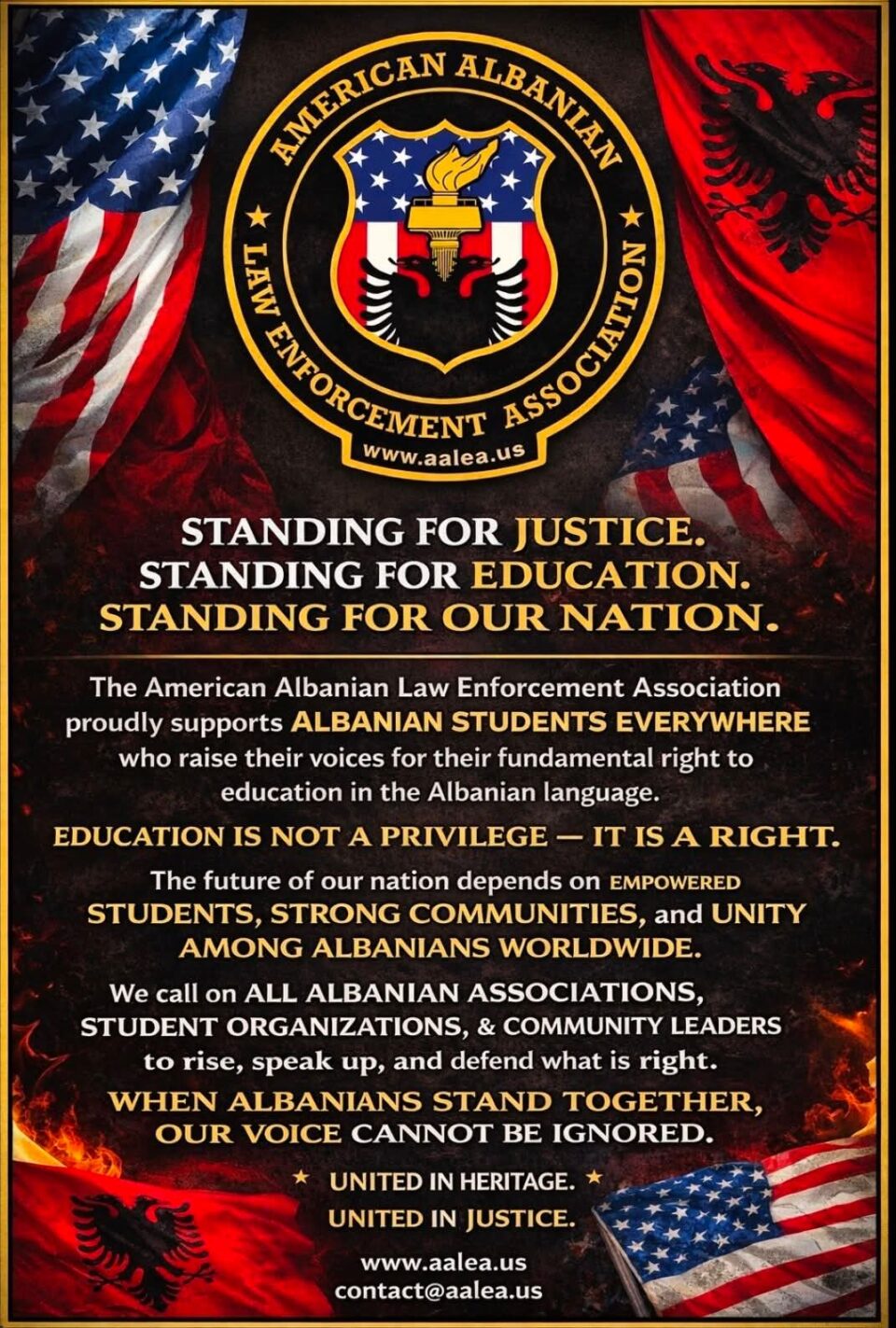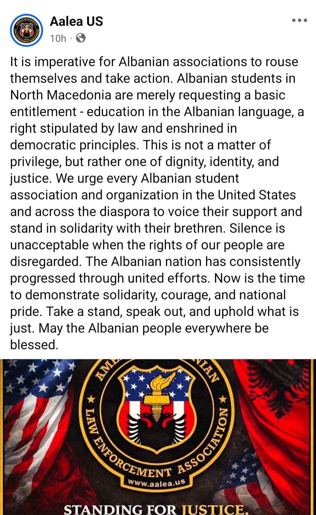 AALEA thekson se kjo nuk është një çështje privilegji, por e dinjitetit, identitetit dhe drejtësisë. Shoqata u bën thirrje të gjitha organizatave shqiptare në Shtetet e Bashkuara dhe diasporë të shprehin mbështetje dhe solidaritet me studentët dhe komunitetin shqiptar. Heshtja është e papranueshme kur të drejtat e shqiptarëve injorohen.