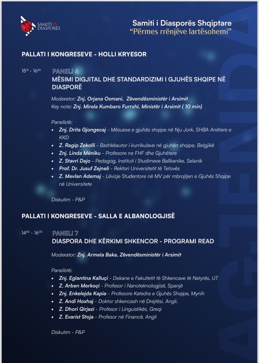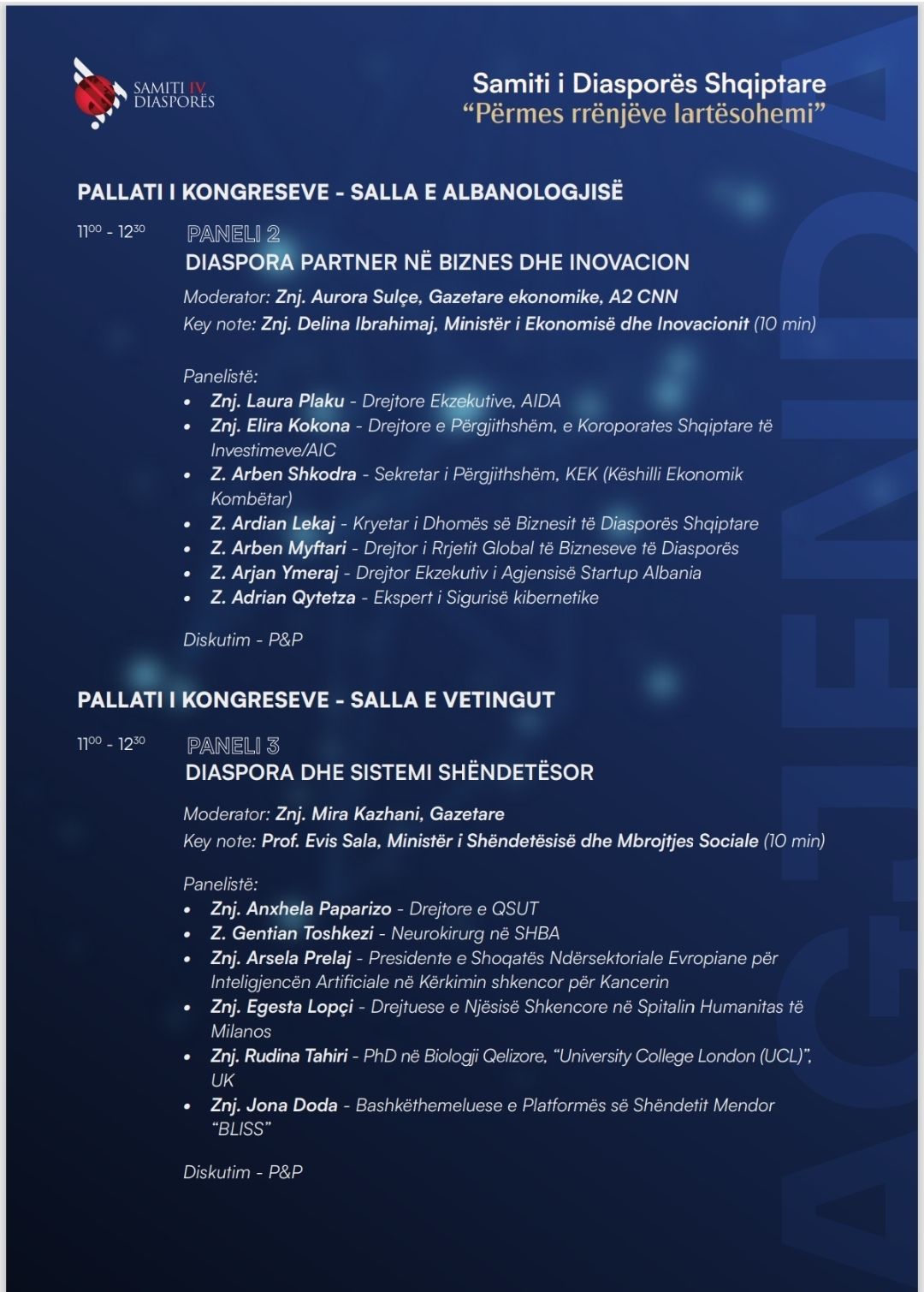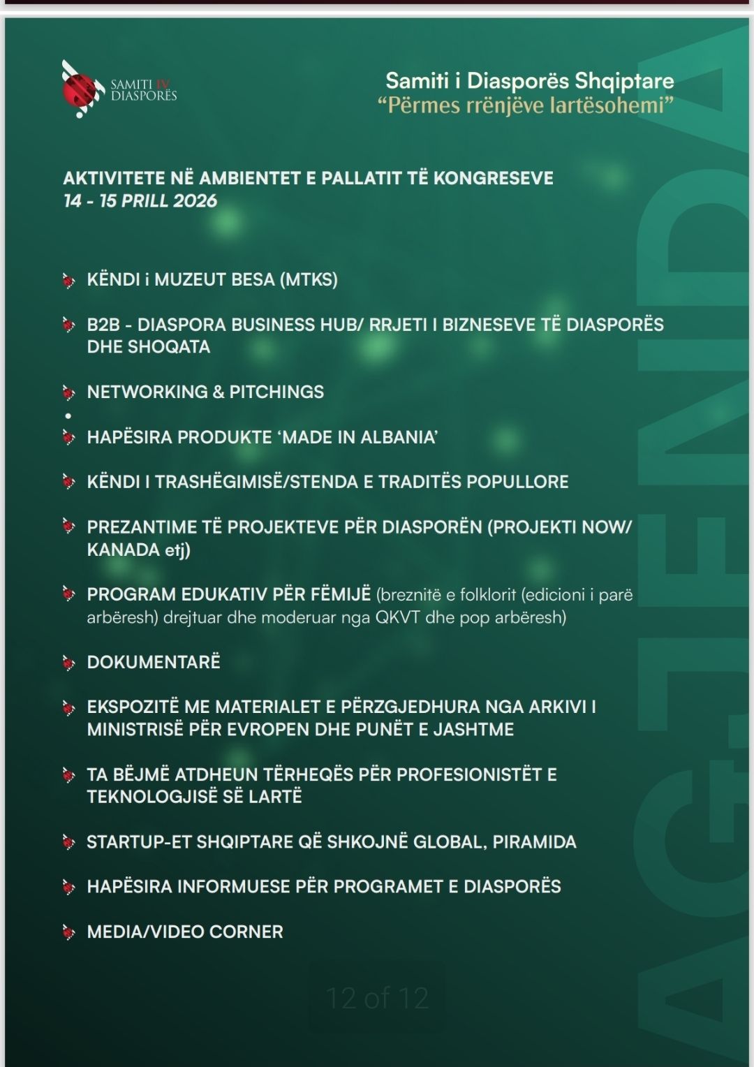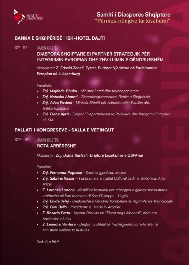 Gjatë këtyre ditëve do të organizohen edhe diskutime në panele të ndryshme mbi kontributin e diasporës shqiptare në fusha si ekonomia, politika, kultura, teknologjia dhe biznesi, duke krijuar mundësi të reja bashkëpunimi dhe rrjetëzimi mes shqiptarëve në mbarë botën.