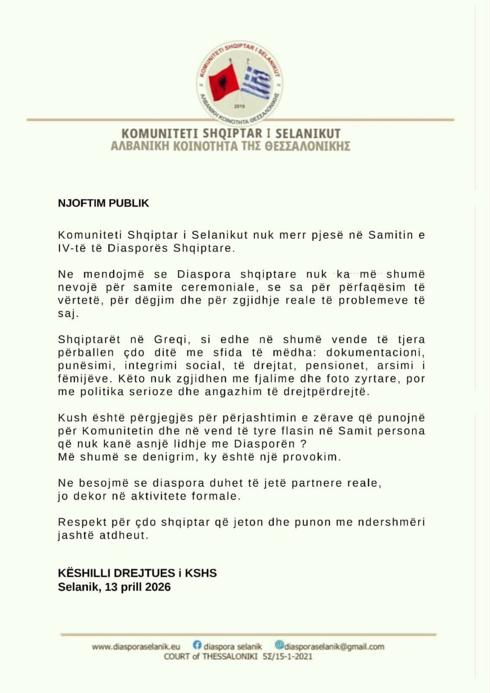 Komuniteti Shqiptar i Selanikut, një prej komuniteteve më të mëdha të shqiptarëve në Greqi, përmes një komunikate publike ka njoftuar se do të bojkotojë Samitin e IV-t të Diasporës që po zhvillohet në Tiranë.