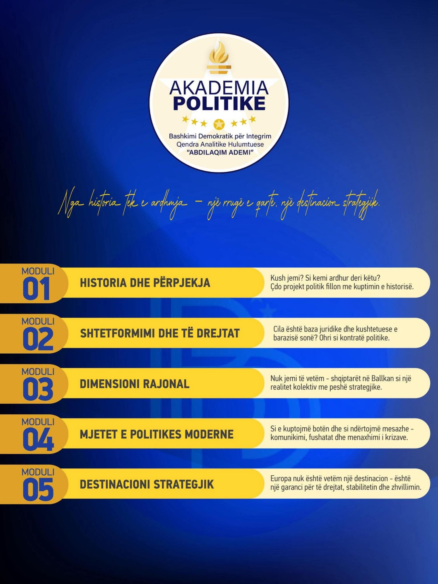 Programi përfshin 5 module thelbësore: nga përpjekja historike te lindja e BDI-së, Marrëveshja e Ohrit – themeli i shtetit të ri, Shqiptarët në rajon – dimensioni kombëtar dhe rajonal, komunikimi politik dhe integrimi europian.